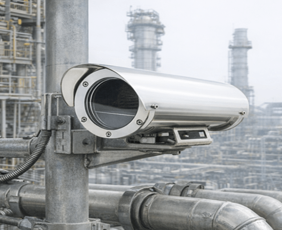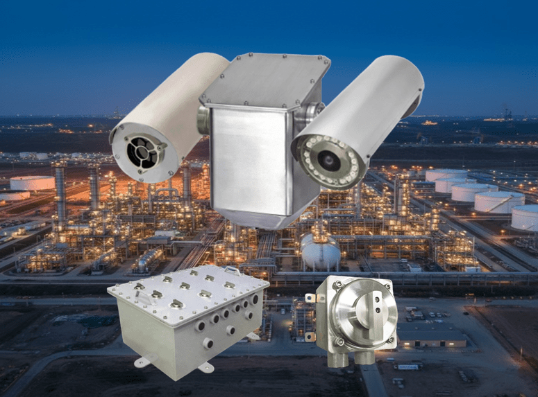 提供工業級防爆 PTZ 攝影機與防護罩,適用於石化、能源、礦業等高風險環境,確保全天候穩定監控。